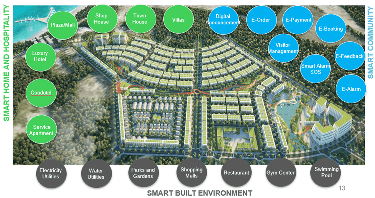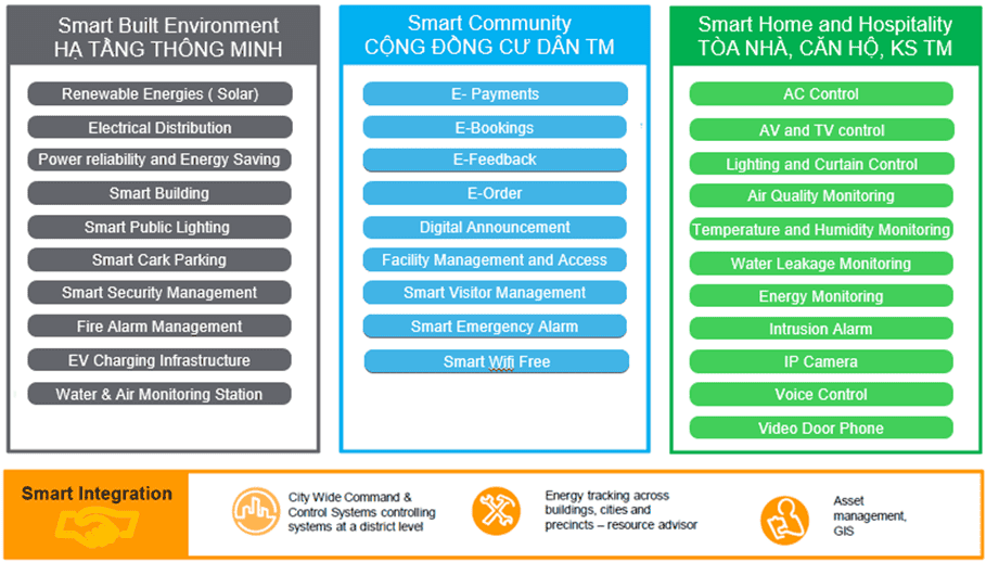 •Hạ tầng thông minh: bao gồm giải pháp cho quản lý các hệ thống cơ điện, điện nhẹ trong tổng thể hạ tầng trong khu đô thị cũng như mỗi tòa nhà trong khu đô thị, như hệ thống cấp điện, hệ thống chiếu sáng thông minh, hệ thống giám sát năng lượng, hệ thống cấp thoát nước, hạ tầng cho hệ thống sạc xe điện, hệ thống an ninh thông minh, bãi đỗ xe thông minh, giám sát báo cháy, giám sát chất lượng nước, không khí trong khu đô thị, … Toàn bộ hạ tầng này được kết nối trên tảng IoT, cho phép đồng bộ hóa dữ liệu để quản lý và phát triển các tiện ích cho cư dân.