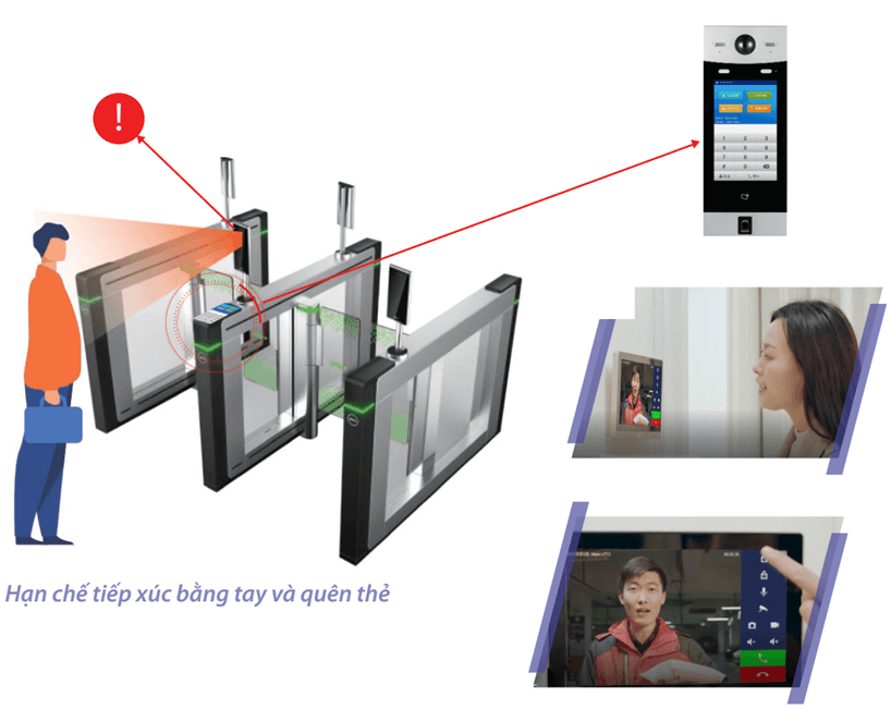 Quy trình ra vào không tiếp xúc – Don’t Touch: Người của tòa nhà có thể xác nhận ra vào bằng khuôn mặt hoặc mã QR code được cấp riêng khi đi qua khu vực kiểm soát. Ngoài ra , hệ thống kiểm soát ra vào được kết hợp với hệ thống chuông hình Video Door Phone trong tòa nhà cho phép khách có thể liên hệ với chủ nhà để cấp quyền ra vào. Khi khách đến chơi sẽ gọi điện qua các bộ Lobby phone lắp ngay tại cửa an ninh hoặc sảnh lễ tân, khi chủ nhà đồng ý sẽ gửi mã QR code cho khách để ra vào. Với các công nghệ hiện đại được áp dụng, việc kiểm soát ra vào sẽ hạn chế tối đa việc tiếp xúc trực tiếp với thiết bị.